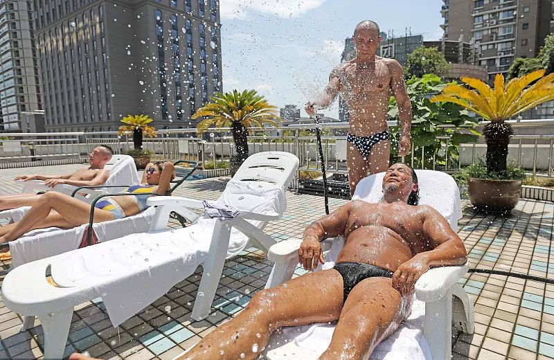7月20日,杭州重回高温,中午太阳最猛烈的时候,平海路维景大酒店户外游泳池平台上,健美爱好者们正享受日光浴晒出美黑的健康肤色。视觉中国 图