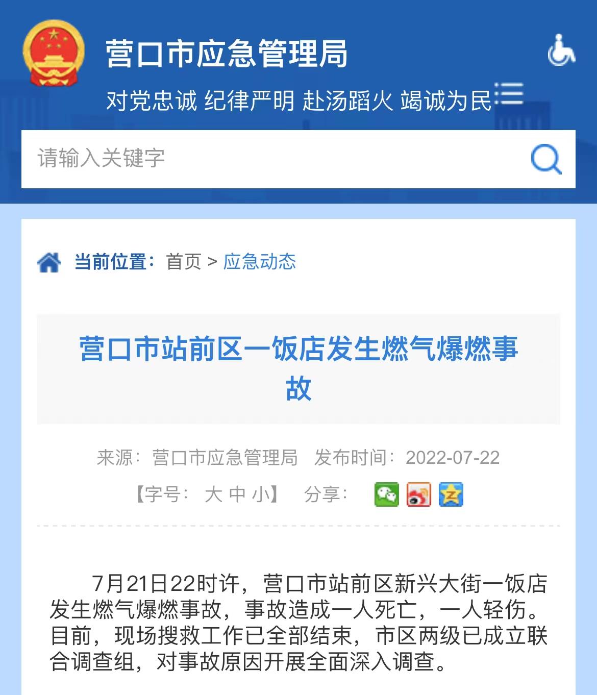 据营口市应急管理局发布消息,7月21日22时许,辽宁省营口市站前区新兴大街一饭店发生燃气爆燃事故,事故造成一人死亡,一人轻伤。目前,现场搜救工作已全部结束,市区两级已成立联合调查组,对事故原因开展全面深入调查。