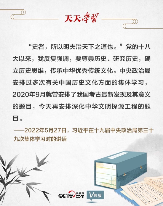 为深入了解中华文明五千多年发展史,推动把中国文明历史研究引向深入,推动全党全社会增强历史自觉、坚定文化自信,2022年5月27日,十九届中央政治局就深化中华文明探源工程进行第三十九次集体学习。习近平总书记引用古语“史者,所以明夫治天下之道也”,强调要尊崇历史、研究历史,确立历史思维,传承中华优秀传统文化。
