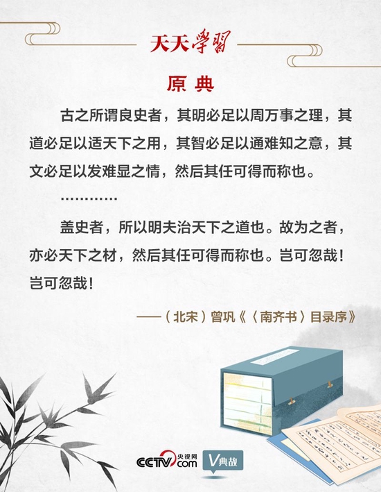 《〈南齐书〉目录序》是曾巩为“二十四史”之一的《南齐书》所写的一篇序文,体现了曾巩的史学研究价值取向。文章围绕着“良史(优秀的史官)”二字展开。曾巩认为,“古之所谓良史者,其明必足以周万事之理,其道必足以适天下之用,其智必足以通难知之意,其文必足以发难显之情”。曾巩在唐代史学家刘知幾“史才三长(才、学、识)”基础上,将“良史”的标准引申为四点:明、道、智、文。其中,文、明、智相当于才、学、识,而“道”则是曾巩的发展,并被摆在核心位置。曾巩指出,“盖史者,所以明夫治天下之道也。故为之者,亦必天下之材”。曾巩认为,史书要阐明治国安邦的法则和规律,因此史家必须是兼具明、道、智、文的“天下之材”。他提出史家要发挥史学经世致用的作用,修史要总结前朝兴亡的经验教训,为后世提供“法戒”。