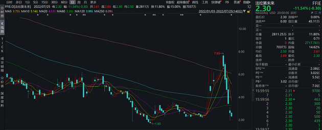 截至当地时间7月25日收盘,法拉第未来跌11.54%,报2.30美元/股。