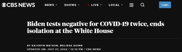 白宫7月21日上午通报说,拜登当天新冠病毒检测结果呈阳性,症状轻微。美国白宫总统医生凯文•奥康纳27日表示,总统拜登新冠病毒检测结果已转阴,将结束隔离。奥康纳在一份致白宫的备忘录中写道,拜登已经完成了5天的治疗和隔离,症状持续改善、几乎完全消失,他26日晚和27日上午的检测结果均为阴性。未来10天,拜登需在身边有人时戴口罩,并将继续接受检测。