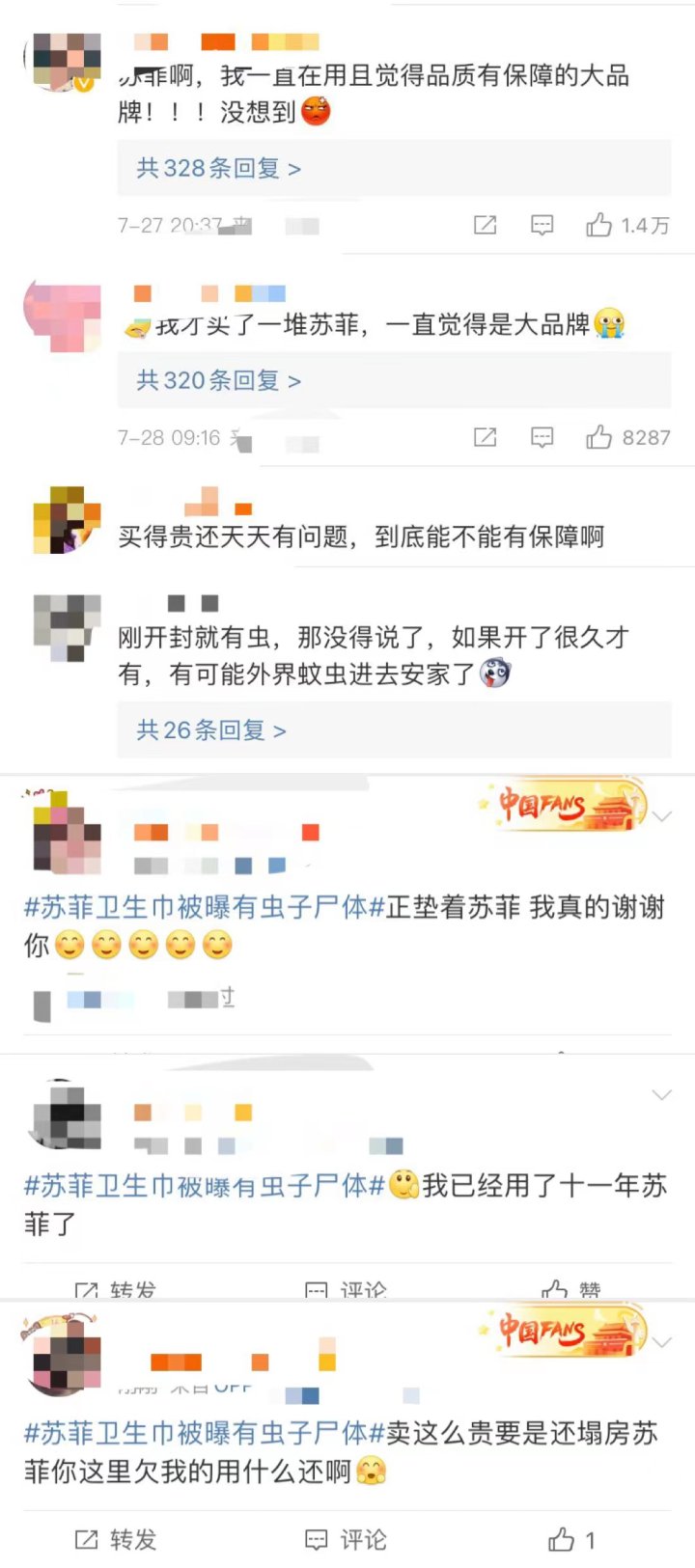 此前7月26日,湖南永州一女子称自己购买苏菲卫生巾使用仅剩3包后,发现其中一包里有干掉的虫子。她表示,“虫子是粘在需要粘贴在裤子上的那一面。如果是虫卵的话应该是活的,而且也没那么大。这种是已经压扁了干干的粘在上面的。"