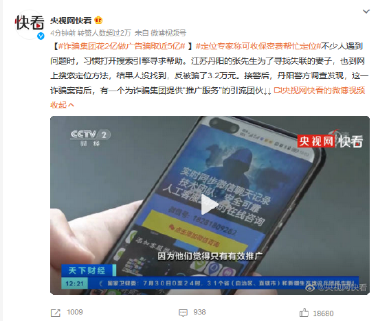 不少人遇到问题时,习惯打开搜索引擎寻求帮助。江苏丹阳的张先生为了寻找失联的妻子,也到网上搜索定位方法,结果人没找到,反被骗了3.2万元。接警后,丹阳警方调查发现,这一诈骗案背后,有一个为诈骗集团提供“推广服务”的引流团伙。
