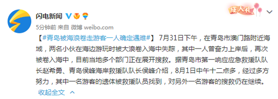 7月31日下午,在青岛市澳门路附近海域,两名小伙在海边游玩时被大浪卷入海中失踪,其中一人曾奋力上岸后,再次被卷入海中,目前当地多个部门正在展开搜救。据青岛市第一响应应急救援队队长赵希勇、青岛侯峰海岸救援队队长侯峰介绍,8月1日中午十二点多,经过多方努力,其中一名游客的遗体被救援队员找到,对另外一名游客的搜救仍在继续。
