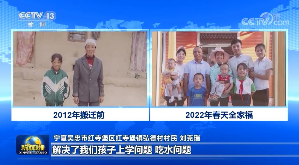 宁夏吴忠市红寺堡区红寺堡镇弘德村村民 刘克瑞:我们一家人从南部山区搬到了红寺堡。解决了我们孩子上学问题、吃水问题,就业也很方便,医院也在家门口,一年下来,我们家毛收入就达到了12万(元)左右,过上了幸福美好的新生活。