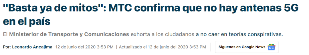 2020年6月12日,秘鲁运输和通信部在YouTube上进行了一场名为“关于天线,你需要知道的一切”的线上直播讲话。通信控制和制裁局局长帕特丽夏·迪亚兹(Paricia Díaz)指出,秘鲁国内尚没有5G天线,并驳斥了将5G同新冠以及新冠疫苗联系起来的阴谋论。“关于电信天线会导致癌症或疾病的神话已经够多了……没有科学研究以任何方式支持天线与癌症、新冠或任何其他疾病有任何关系,”迪亚兹说。