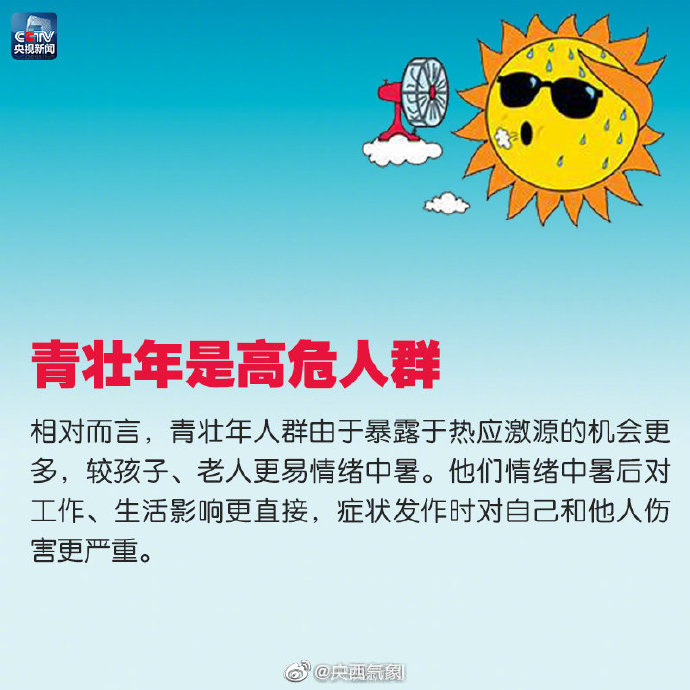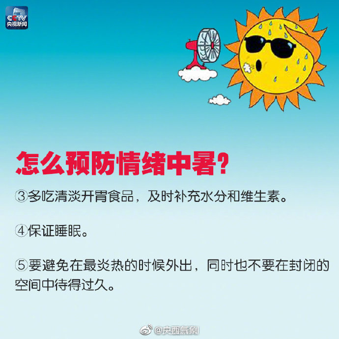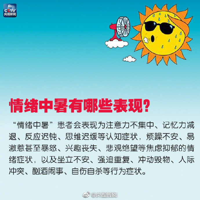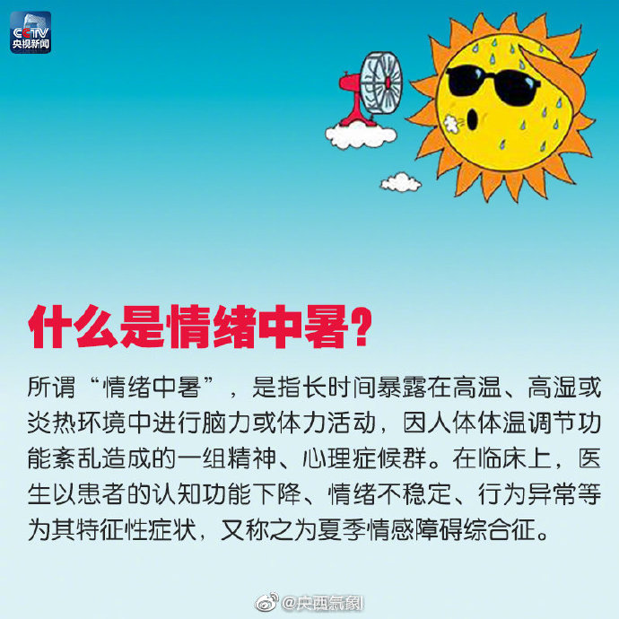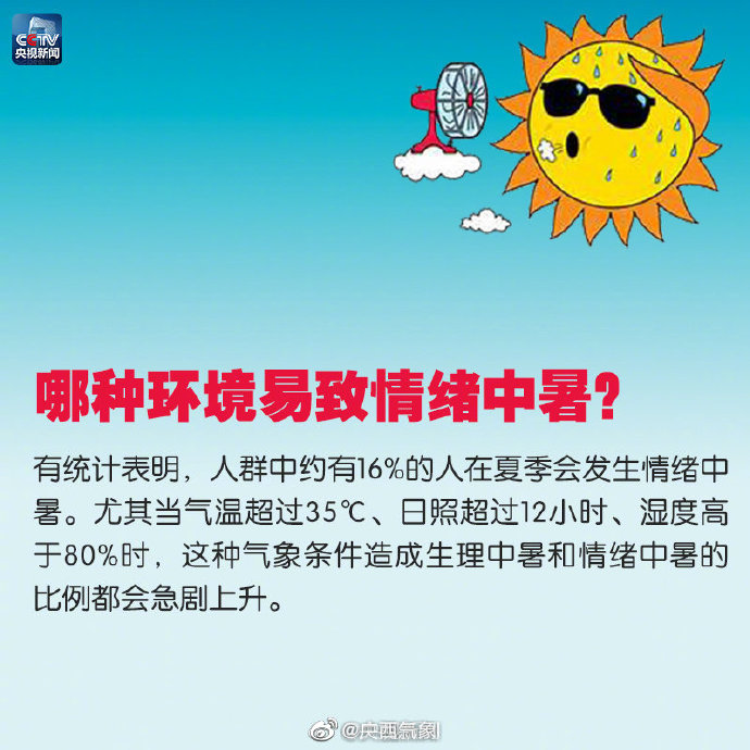 【#高温天心情烦躁小心情绪中暑#】#连续高温女子患上情绪中暑#近日,江苏李女士每晚都开空调,但最多只睡3个小时,情绪也变得烦躁、易怒,动辄对家人发火。经诊断,她这是典型的“情绪中暑”,又称“夏季情感障碍综合征”,是高温影响了人体下丘脑的情绪调节中枢。高温天气不仅“烤”验人的身体也“烤”验心情。9张图教你对付情绪中暑,转存! #今年首发最高级别高温红色预警# (综合我苏特稿、央视新闻)
