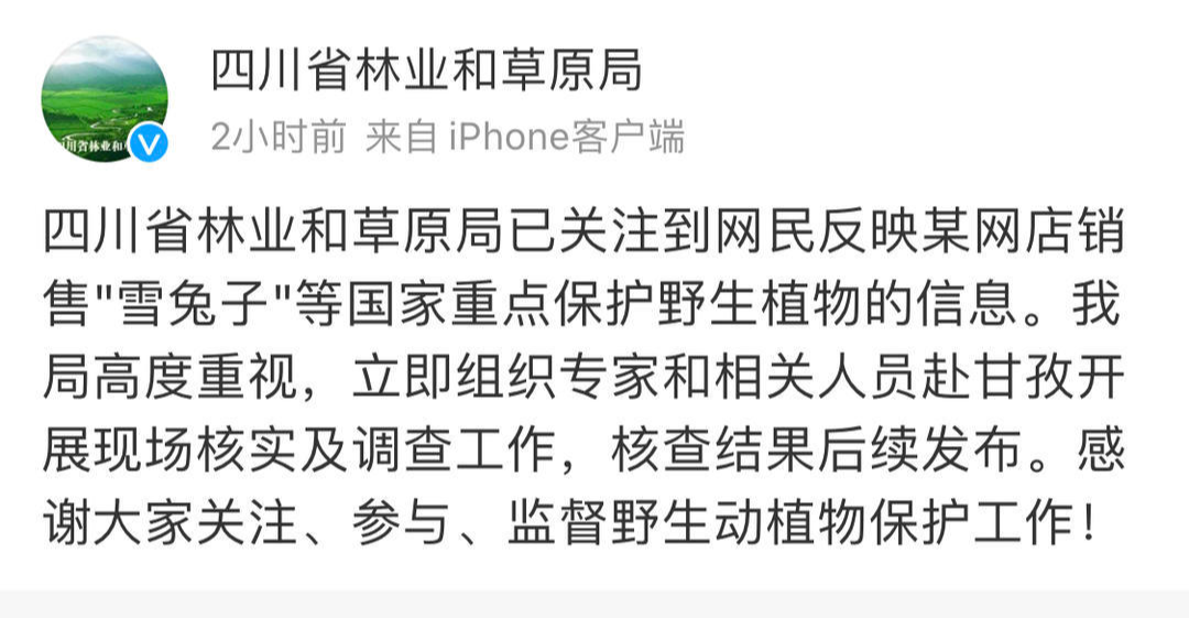 当晚,四川省林业和草原局官微回应称,已关注到网民反映某网店销售“雪兔子”等国家重点保护野生植物的信息。该局高度重视,立即组织专家和相关人员赴甘孜开展现场核实及调查工作,核查结果后续发布。