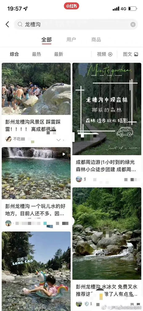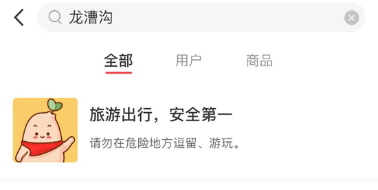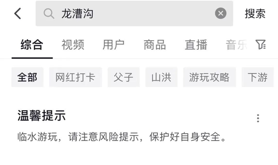 小红书上关于龙漕沟的相关游玩攻略已被下架,搜索“龙漕沟”,显示的为“旅游出行,安全第一”字样,但搜索“野游”,依然有不少野外玩水、溯溪目的地攻略;抖音亦下架了龙漕沟相关推荐视频,搜索“龙漕沟”,出现一条温馨提示:“临水游玩,请注意风险提示,保护好自身安全”,输入“野游”字样,也会出现这则提示;高德地图上的“龙槽(漕)沟景区”已无法定位,点击后会显示附近其他正规景区。