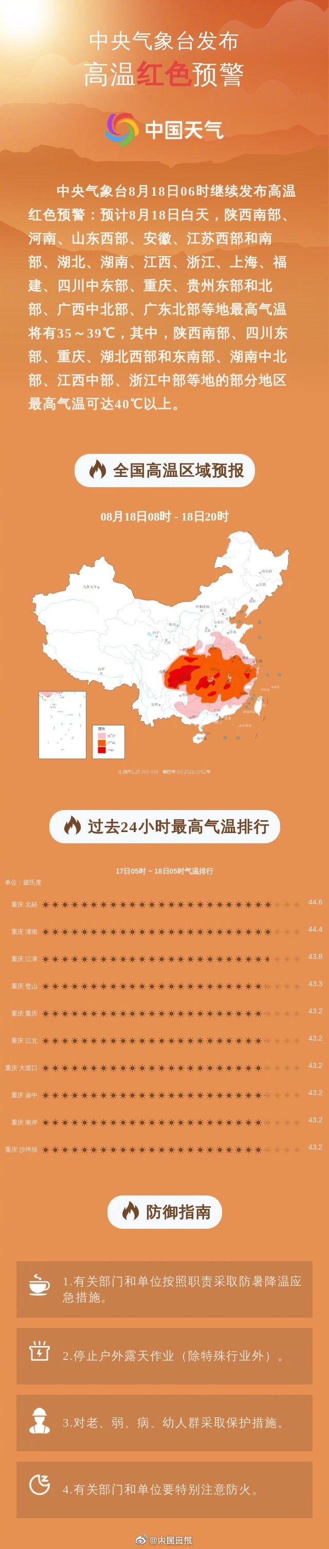 据@中国天气 ,8月18日白天,陕西南部、河南、山东西部、安徽、江苏西部和南部、湖北、湖南、江西、浙江、上海、福建、四川中东部、重庆、贵州东部和北部、广西中北部、广东北部等地最高气温将有35~39℃。部分地区可达40℃以上。注意防暑!