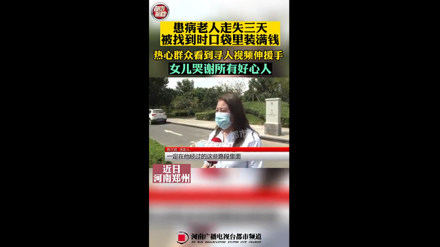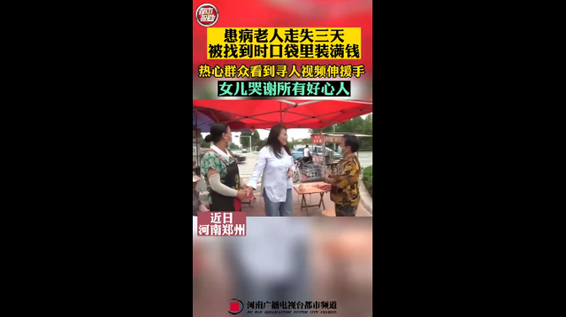 近日,河南郑州。杨女士76岁的老父亲在医院看病时走失,将近3天杳无音信,出去时没有带钱也没有带手机。一家人心急如焚求助都市报道,就在寻人视频发布当天,有热心群众根据视频认出杨女士的父亲,提供吃喝留住老人家。杨女士和家人来接父亲时,在他的口袋里发现了满满当当的零钱,再也绷不住感动的泪水.....“谢谢所有好心人,真的谢谢你们!”