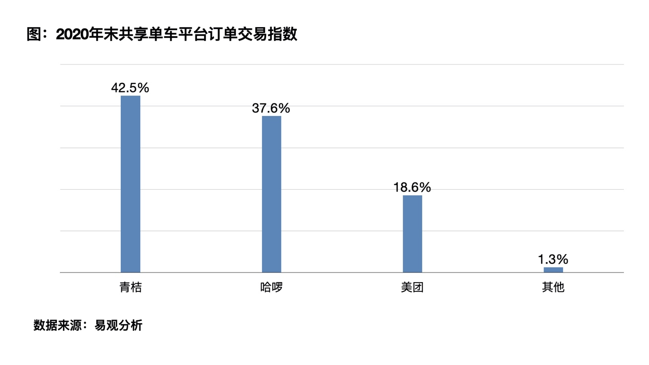 到了2020年末,根据易观分析的报告显示,青桔、哈啰和美团到订单交易指数分别为42.5%、37.6%和18.6%,留给其他共享单车平台的份额仅剩1.3%。由此可见,在经过多年的市场竞争后,共享单车市场已经形成“三足鼎立”的新格局。