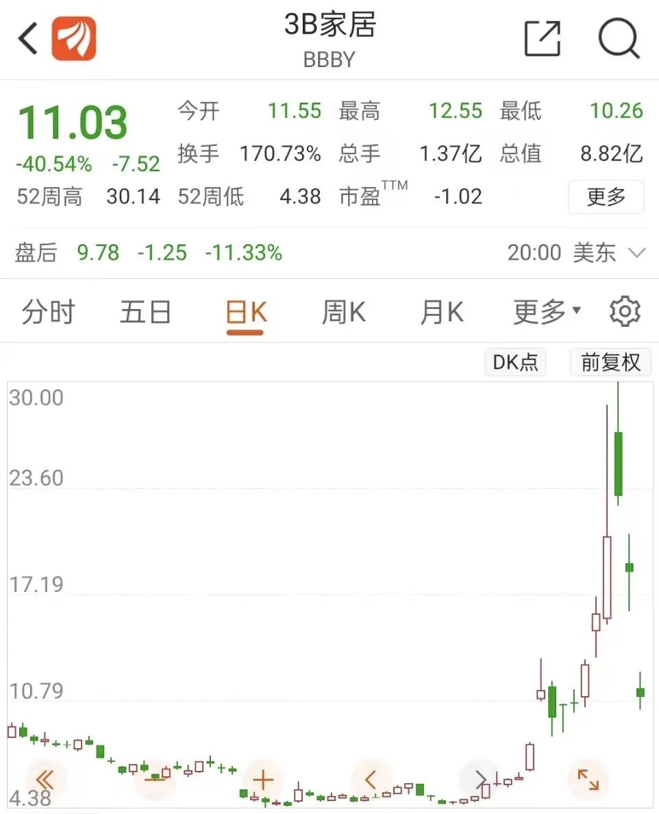 随后,美股“散户大本营”Reddit论坛WSB版块曝出消息,华尔街知名投资人瑞安·科恩 (Ryan Cohen)持有大量3B家居股票,消息一出,瞬间引爆了3B家居股价,短短1个月内,累计暴涨超400%,最高价一度涨至30美元/股。