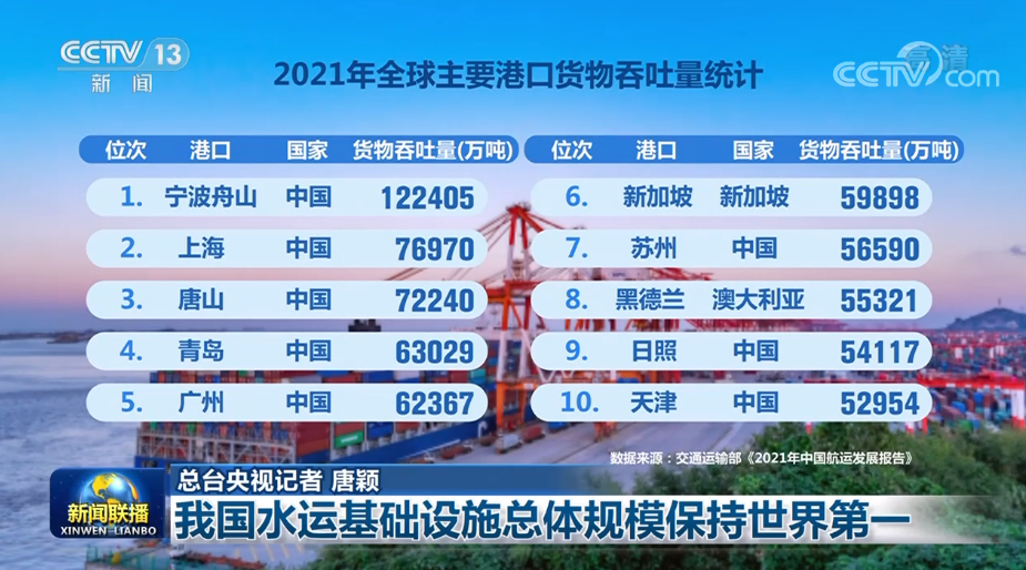 央视网消息(新闻联播):交通运输部今天(8月25日)发布数据,截至2021年底,我国港口拥有生产用码头泊位20867个,万吨级及以上泊位2659个,内河航道通航里程12.8万公里,其中高等级航道超过1.6万公里,基本形成了长三角、津冀、粤港澳等世界级的港口群。水运基础设施体系加速完善,总体规模保持世界第一。