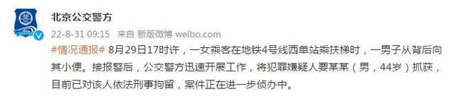 8月29日17时许,一女乘客在地铁4号线西单站乘扶梯时,一男子从背后向其小便。接报警后,公交警方迅速开展工作,将犯罪嫌疑人要某某(男,44岁)抓获,目前已对该人依法刑事拘留,案件正在进一步侦办中。