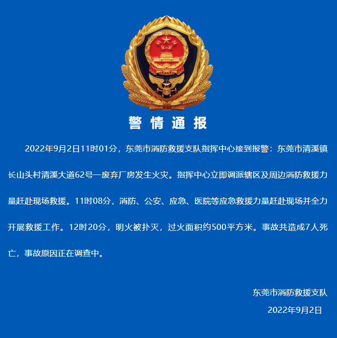 据东莞消防微信公众号消息,2022年9月2日11时01分,东莞市消防救援支队指挥中心接到报警:东莞市清溪镇长山头村清溪大道62号一废弃厂房发生火灾。指挥中心立即调派辖区及周边消防救援力量赶赴现场救援。11时08分,消防、公安、应急、医院等应急救援力量赶赴现场并全力开展救援工作。12时20分,明火被扑灭,过火面积约500平方米。事故共造成7人死亡,事故原因正在调查中。