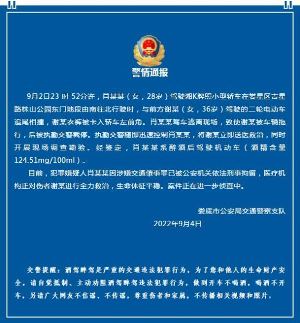 9月2日23 时 52分许,肖某某(女,28岁)驾驶湘K牌照小型轿车在娄星区吉星路株山公园东门地段由南往北行驶时,与前方谢某(女,36岁)驾驶的二轮电动车追尾相撞,谢某衣裤被卡入轿车左前角。肖某某驾车逃离现场,致使谢某被车辆拖行,后被执勤交警截停。执勤交警随即迅速控制肖某某,将谢某立即送医救治,同时开展现场调查勘验。经鉴定,肖某某系醉酒后驾驶机动车(酒精含量124.51mg/100ml)。