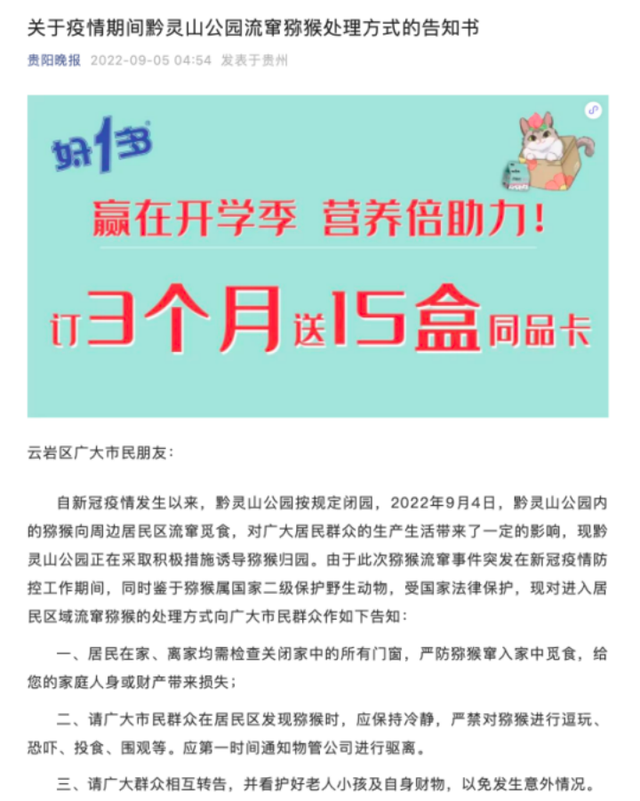 9月4日,贵阳云岩区自然资源局回应,近期全市新冠疫情形势严峻,黔灵山公园按政策规定闭园后,园内猕猴向周边居民区流窜觅食,正在采取措施诱导猕猴归园。工作人员建议居民关闭家中所有门窗,严防猕猴窜入觅食;发现猕猴时不要逗玩、投食,并通知物管公司进行驱离。