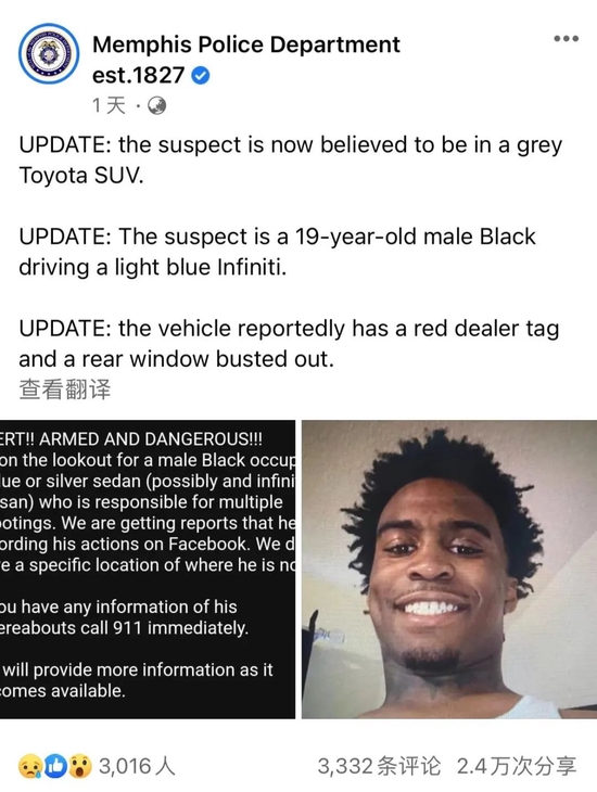 警报称,一名19岁的黑人男子正在孟菲斯市内疯狂射击,还在脸书上直播自己行凶的经过。↓↓
