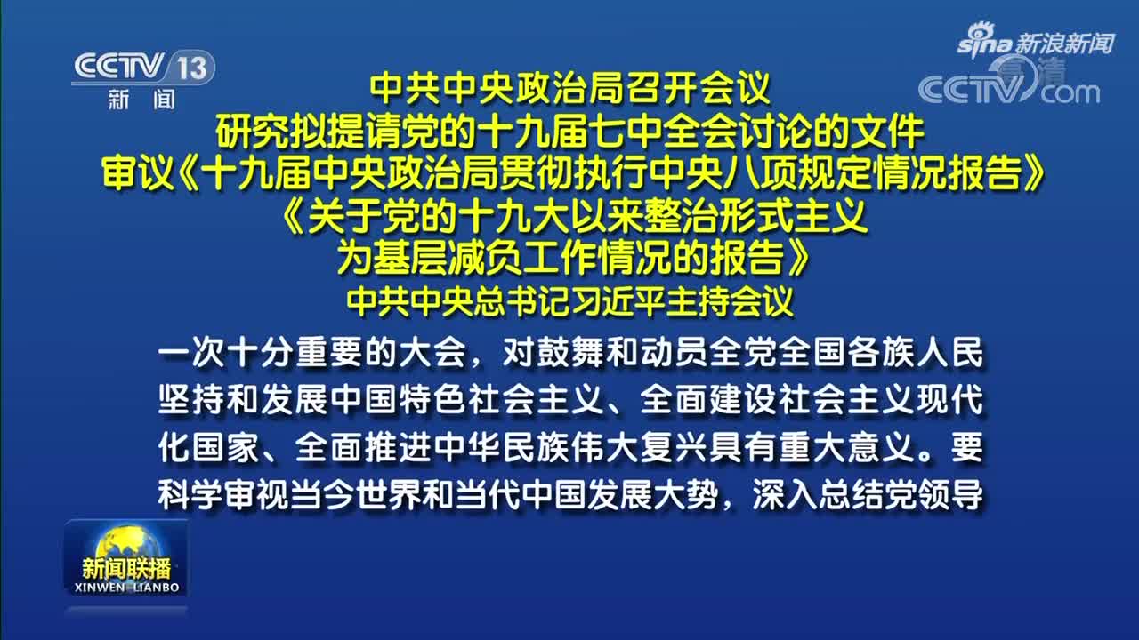原标题:中共中央政治局召开会议 研究拟提请党的十九届七中全会讨论的文件 审议《十九届中央政治局贯彻执行中央八项规定情况报告》《关于党的十九大以来整治形式主义为基层减负工作情况的报告》 中共中央总书记习近平主持会议