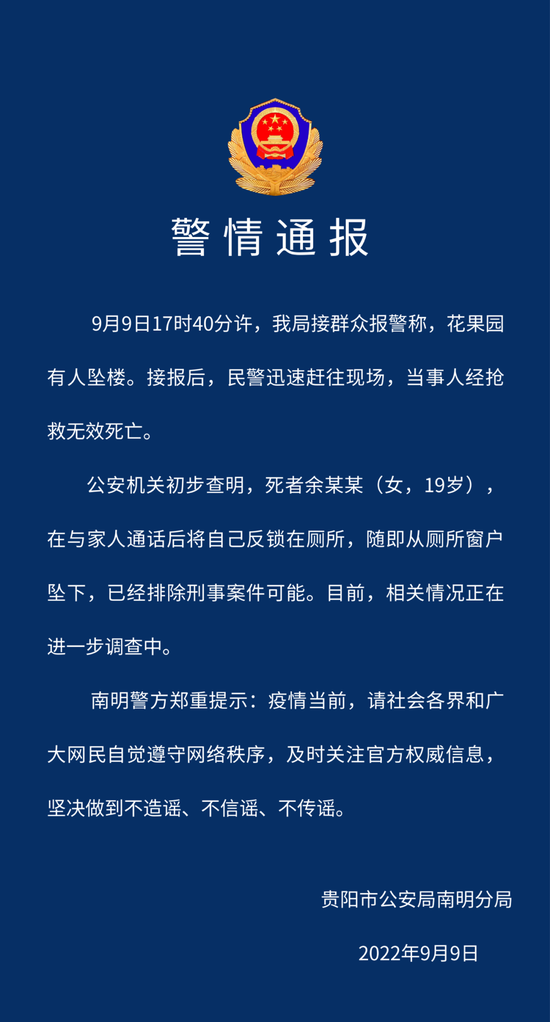 公安机关初步查明,死者余某某(女, 19岁),在与家人通话后将自己反锁在厕所,随即从厕所窗户坠下,已经排除刑事案件可能。目前,相关情况正在进一步调查中。