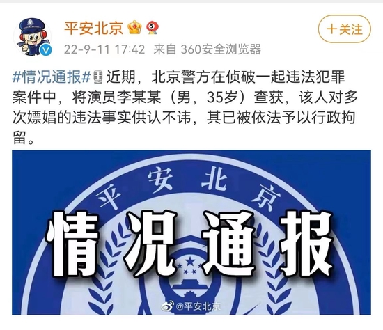 据“平安北京”消息,近期,北京警方在侦破一起违法犯罪案件中,将演员李某某(男,35岁)查获,该人对多次嫖娼的违法事实供认不讳,其已被依法予以行政拘留。有媒体记者通过权威渠道了解到,李某某为李易峰。