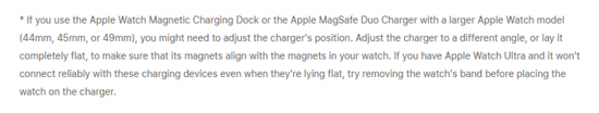 根据今天更新的支持文档,苹果表示 Apple Watch Ultra、较大型号的 Apple Watch 在使用 MagSafe Duo 充电器进行充电的时候需要调整位置或将其完全平放,以确保充电器与 Apple Watch 正确连接。
