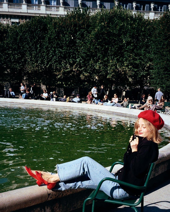 或者像Camille一样,用牛仔裤搭配有点小方跟的款式,俏皮的红色与贝雷帽呼应,把复古美展现到极致。
