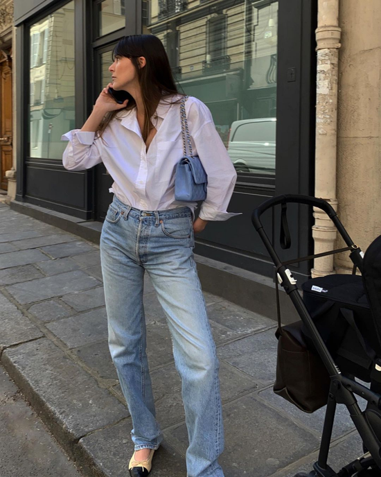 这套搭配思路不要太easy,白衬衫加牛仔裤,再来一双芭蕾舞单鞋收尾,经典单品完全不用担心过时。