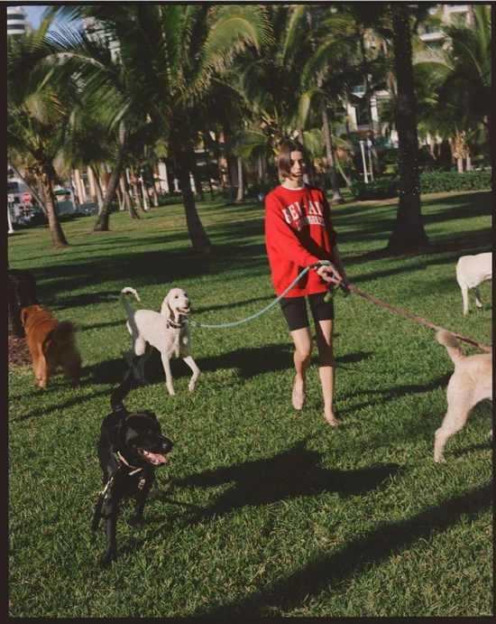 红色卫衣加骑行裤,妥妥的运动风,配上轻便的裸色芭蕾舞单鞋,让人有点联想到戴妃的风格,但是把运动鞋换成了芭蕾舞单鞋,运动风也优雅。