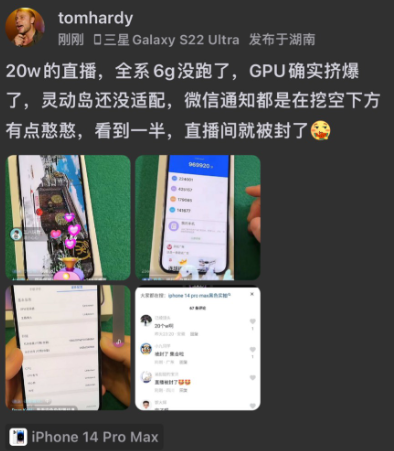根据该网友的提前上手,iPhone 14 Pro Max 的安兔兔跑分达到了 969920。此外,“灵动岛”设计目前和微信的适配还不够好,通知会在挖孔下方出现,需要等待后续适配。