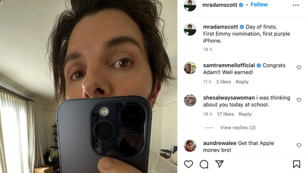 值得一提的是,苹果 Apple TV+ 惊悚片《Severance》的演员 Adam Scott 似乎已经提前用上了 iPhone 14 Pro。他发了一张自拍照,并写道“第一次提名艾美奖,第一部紫色 iPhone”。