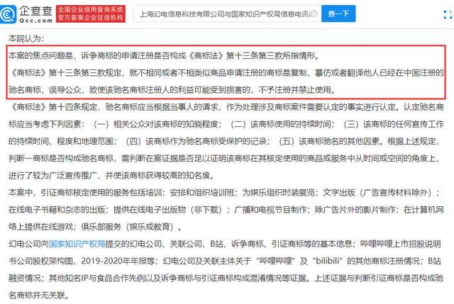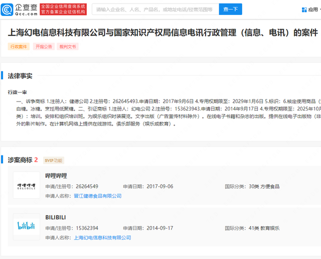 企查查APP显示,9月13日,B站关联公司上海幻电信息科技有限公司与国家知识产权局信息电讯行政管理(信息、电讯)行政一审判决书公开。文书显示,幻电公司对健德公司所持诉争商标“哔哩哔哩”提出无效宣告请求,并向国家知识产权局提交相关证据材料。