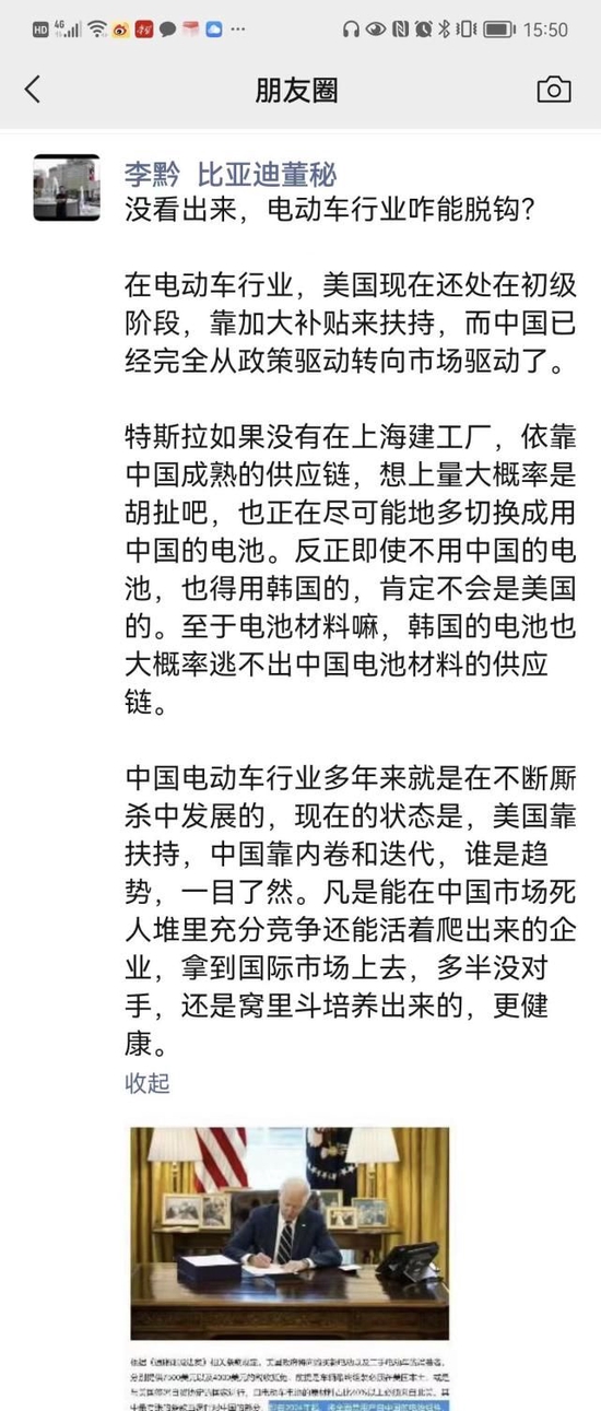 财联社9月15日电,昨晚网络中传出一张截图,称美国IRA法案要求,2024年之后将禁用中国电池。对此,比亚迪董秘李黔15日下午在微信朋友圈发文称,“没看出来,电动车行业咋脱钩?在电动车行业,美国现在还处在初级阶段,靠加大补贴来扶持,而中国已经完全从政策驱动转向市场驱动了。”