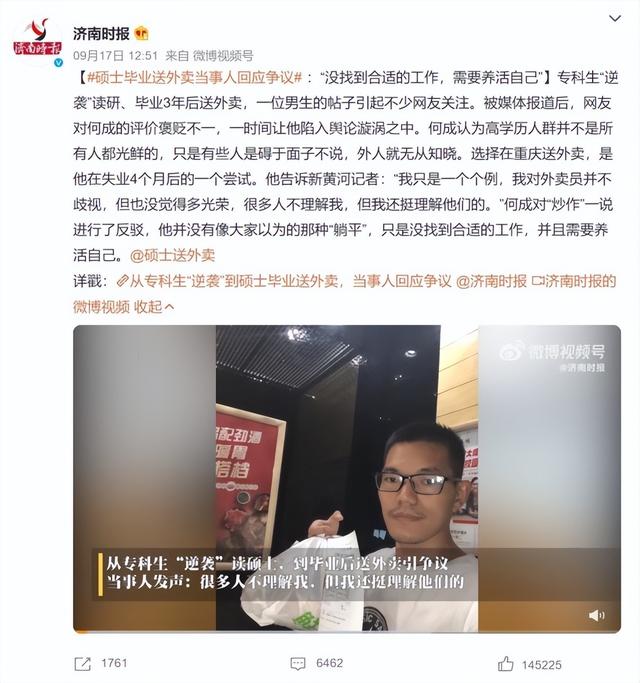 专科生“逆袭”读研、毕业3年后送外卖,何成的经历引发网友关注。有网友认为他至少自食其力,没有躺平,也有网友质疑他浪费资源。