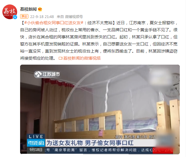 近日,江苏南京,夏女士报警称,自己的房间被人动过,梳妆台上常用的香水、一支品牌口红和一个黄金手链不见了。很快,店长在其合租的同事林某房间里找到丢失的口红。起初,林某只承认拿了口红,但警方在其手机里发现销赃的证据。林某表示,自己想要送女友一支口红,但因经济不宽裕一直没买,直到发现林女士的梳妆台上有,便将东西偷走了。目前,林某因涉嫌盗窃将接受相应的处理。