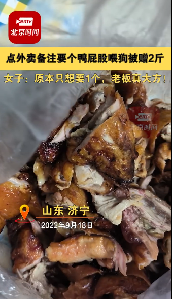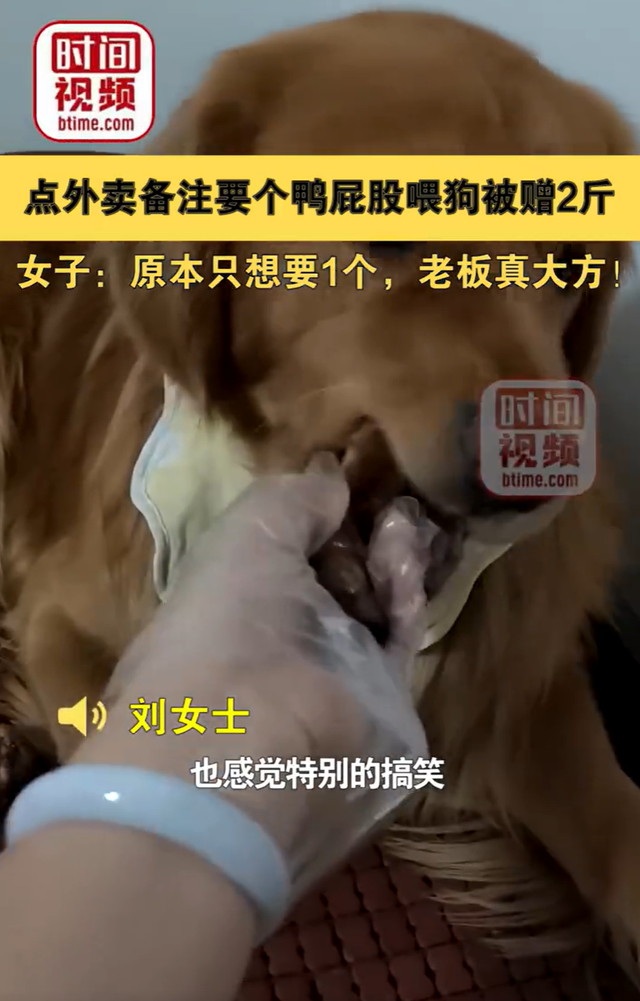 9月21日,据时间视频报道,近日,在山东济宁,刘女士点烤鸭时备注要鸭屁股给金毛解馋,没想到被赠2斤鸭屁股。
