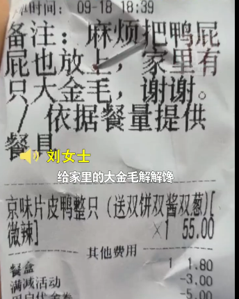 刘女士称:“我点了一份就是一只烤鸭,就想要老板把鸭屁股带上,给家里的大金毛解馋,我收到外卖后打开一看,里面有一大包,当时还以为是一袋鸭肉呢。”