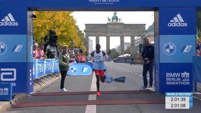 半程过后,为基普乔格带跑的“兔子”陆续退场,基普乔格开始了自己的表演,继续将世界纪录甩在身后。25公里用时1小时11分08秒,比世界纪录快1分16秒。30公里用时1小时25分40秒,比世界纪录快1分05秒。35公里用时1小时40分10秒,比世界纪录快59秒。40公里用时1小时54分53秒,比世界纪录快39秒。冲过终点线,基普乔格的成绩为2小时01分09秒,比原世界纪录快了30秒。