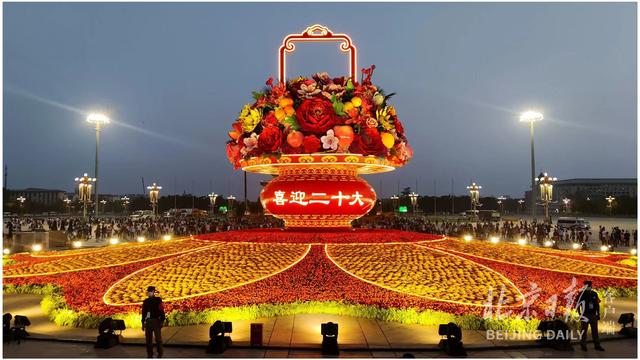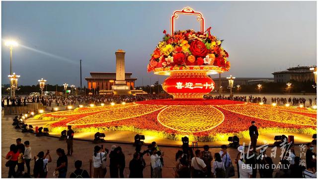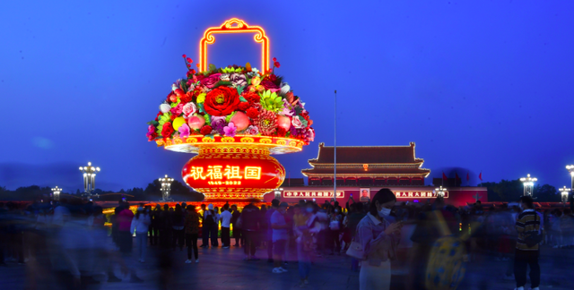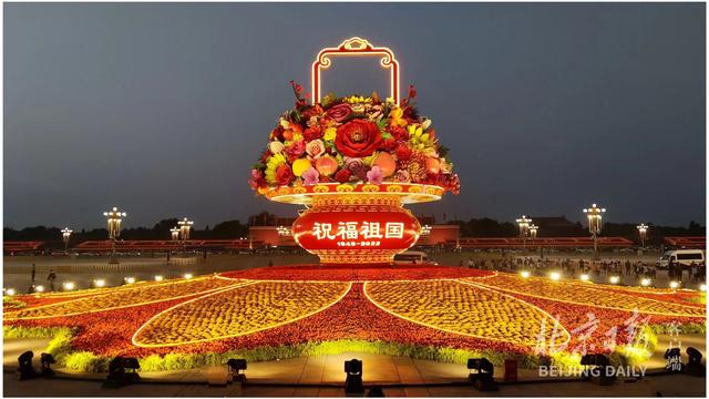 国庆将近,天安门广场上的“祝福祖国”大花篮亮灯,流光溢彩,璀璨夺目。