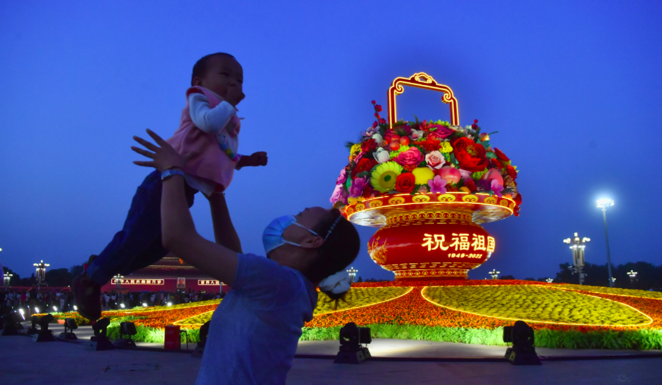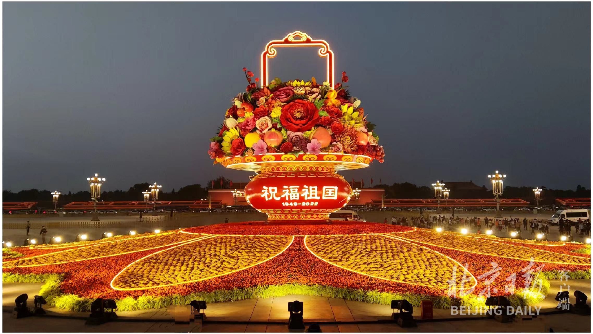 国庆将近,天安门广场上的“祝福祖国”大花篮亮灯,流光溢彩,璀璨夺目。