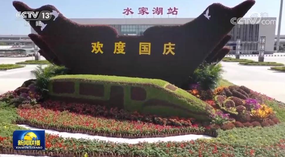 山西新绛用各式鲜花和五彩花灯装点街头。广西贺州用一组组火红的灯笼扮靓城市。在安徽长丰县,近八万盆鲜花组成国庆主题的花坛,摆放出动车、和平鸽等造型,庆祝新中国成立73周年,喜迎党的二十大胜利召开。