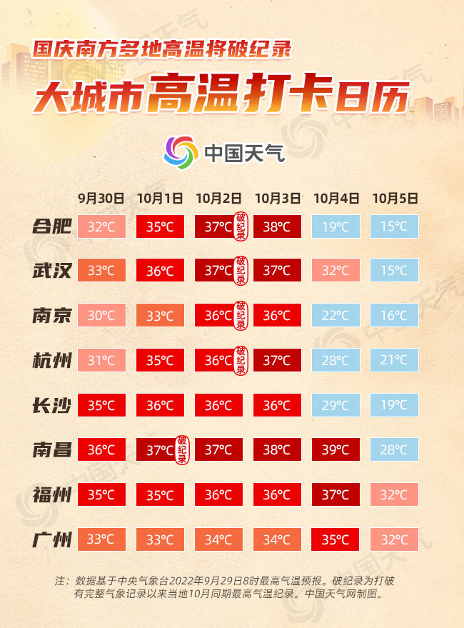 原标题:热如盛夏!国庆假期南方多地气温将连破纪录 大城市高温日历出炉