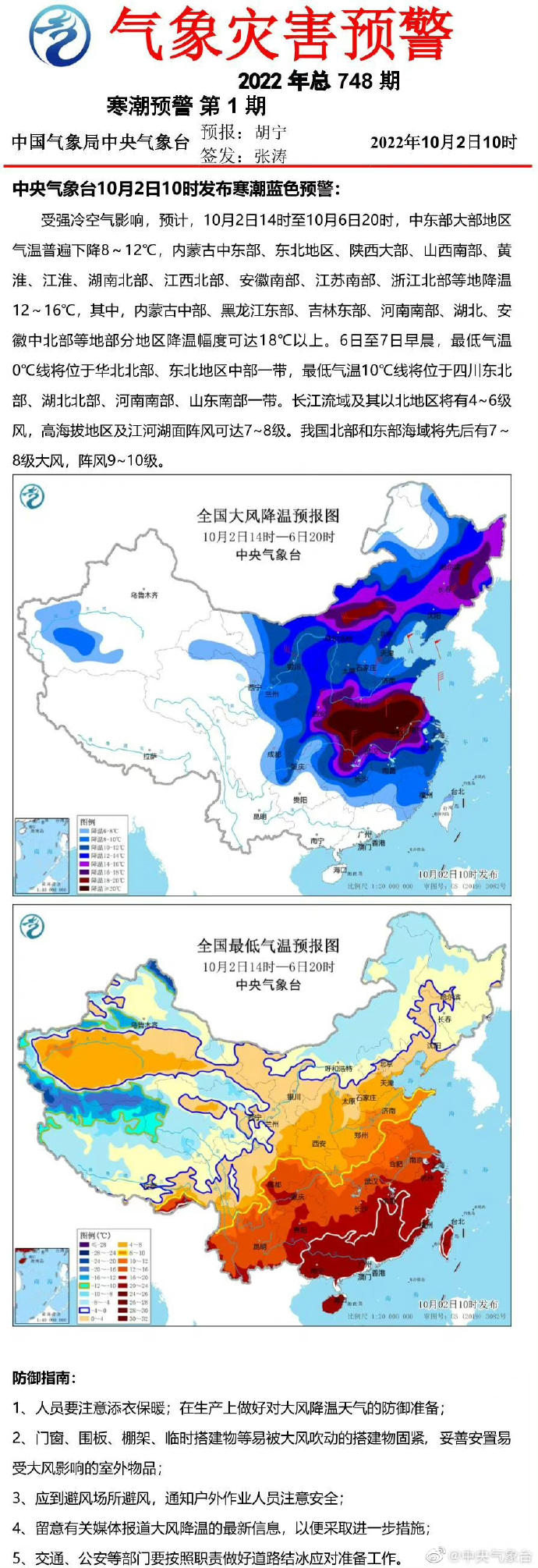 中央气象台今天(10月2日)上午10时发布寒潮蓝色预警,被称为“史上最早寒潮预警”: