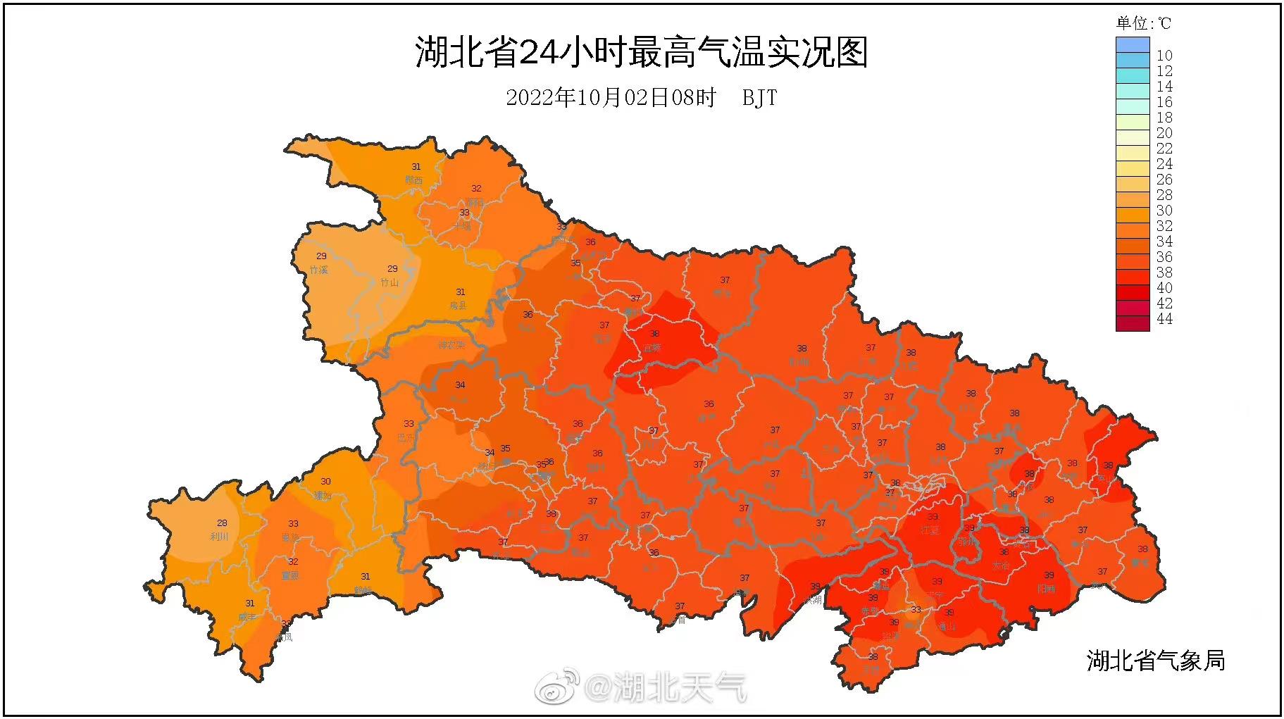 湖北武汉中心气象台2022年10月2日6时53分发布高温橙色预警信号:预计今天白天,宜昌东部、襄阳东部、荆门、荆州、随州、孝感、武汉、黄冈、黄石、咸宁、鄂州、天门、潜江、仙桃最高气温将升至37℃以上,局部可达39℃以上,请注意防范。