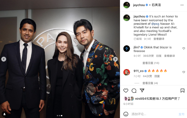 周杰伦晒出了自己和巴黎巨星梅西的合影,此外周杰伦夫妇还与巴黎主席纳塞尔见面并合影。