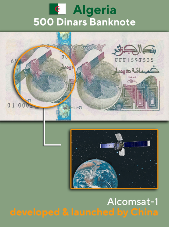 6. 阿尔及利亚 500第纳尔纸币 阿尔及利亚通信卫星一号 由中国研制并成功发射