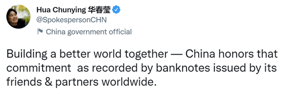 【环球网报道 记者 乌元春】“共同建设一个更美好的世界——中国兑现了这一承诺,并通过其在全世界的朋友和伙伴们所发行的纸币记录了下来。”10月5日晚10时许,华春莹在社交媒体推特上连发13张图,并这样写道。