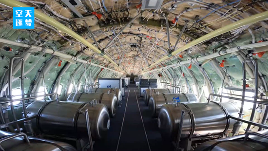 航空工业试飞中心C919大型客机试飞工程师 杜毅洁:这是飞行中的C919飞机,现在我们看到的这些不锈钢的圆筒,里面都放着水,这是水配重系统,是调整飞机的重量重心的。这儿有一个应急离机出口,当飞机发生问题的时候,这里有一个小小的炸药包会把这个门炸开。这个位置就是我的工作岗位,在这个地方我们能看到很多的监控画面,我们就在这个地方去监控飞机的参数。